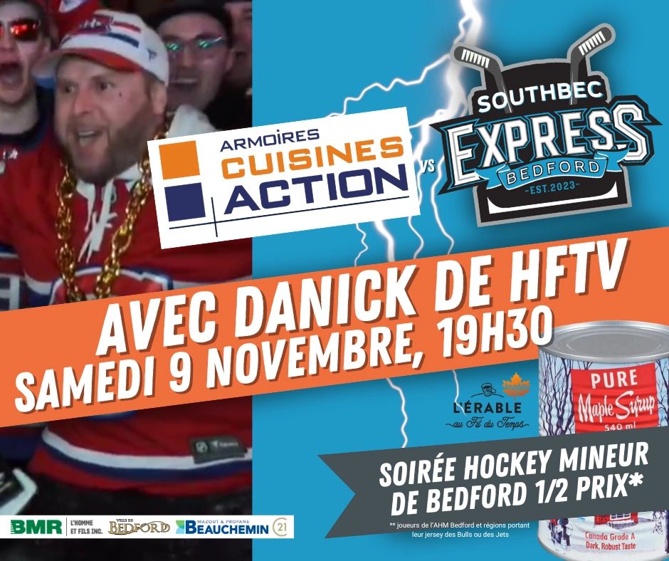 Tous les joueurs du Hockey Mineur Bedford et région portant leur jersey d’équipe (Bulls et Jets) entrent à moitié prix ! et les 200 premiers partisans recevront une canne pour faire du bruit, gracieuseté de L'Érable au Fil du Temps ! 🍁